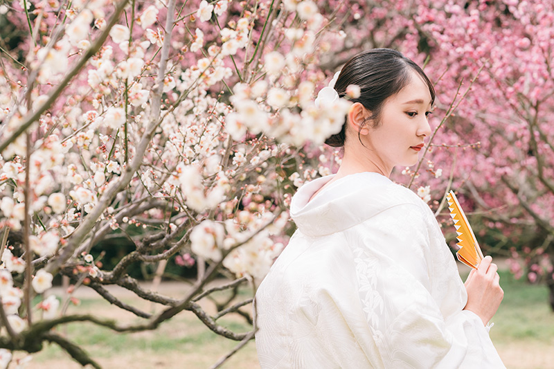 - 雰囲気:桜より控えめで落ち着いたピンク色や白の梅は、和装の美しさを引き立て、気品ある写真になります。梅の香りも楽しめます。